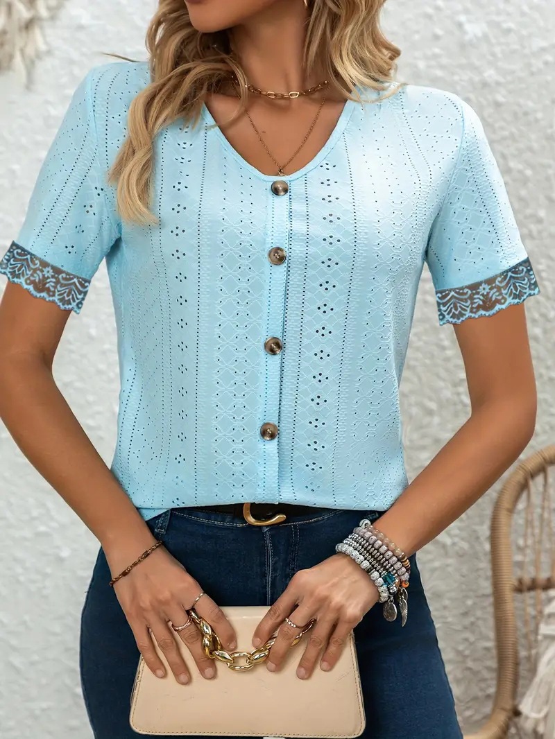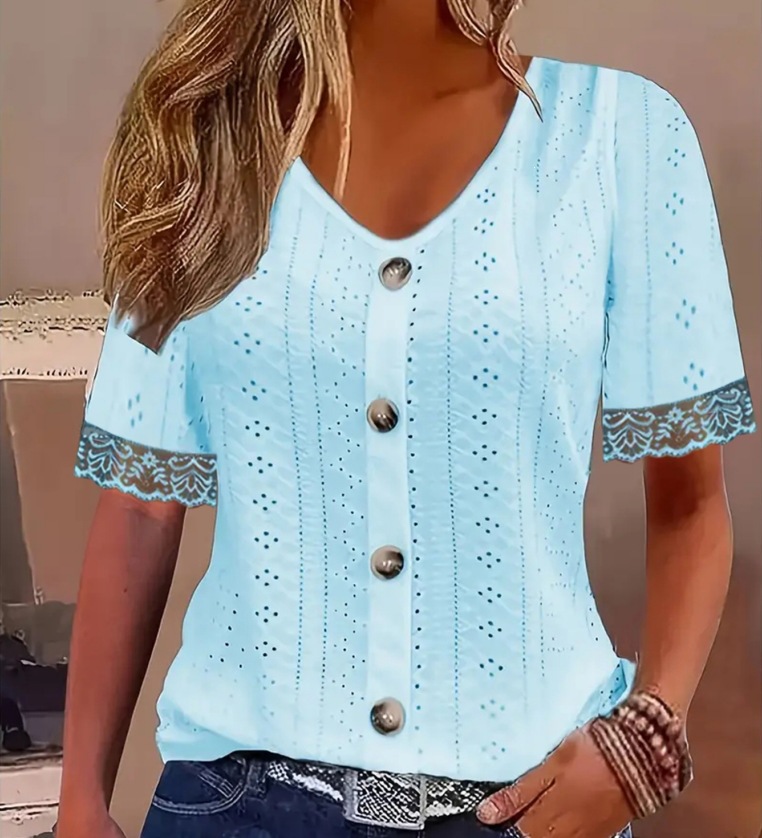 Spring/Summer 2026 Breathable T-Shirts: Jacquard Cutouts, V-Neck with Buttons, Lace Paneling